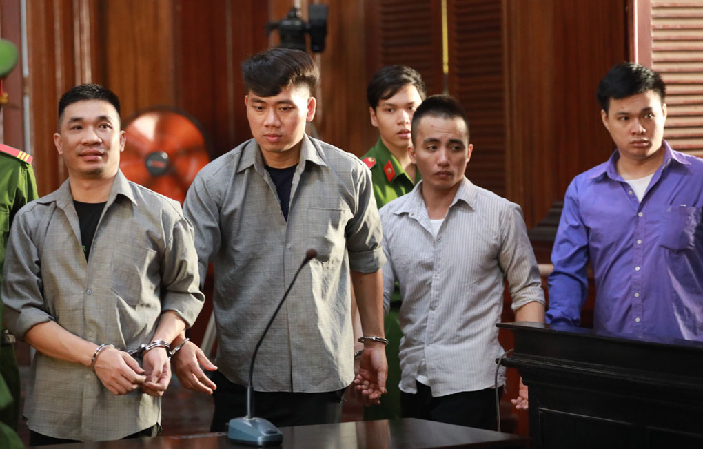 Văn Kính Dương (trái) và các đồng phạm được dẫn vào phòng xử sáng 17/7. Ảnh: Hữu Khoa.