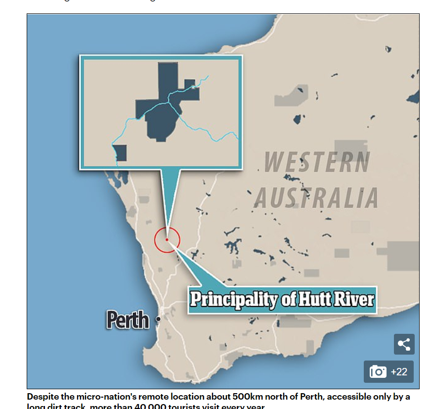 Công quốc Hutt River tự xưng là một quốc gia có chủ quyền độc lập thành lập vào ngày 21/4/1970. Lãnh thổ này nằm cách thành phố Perth 517 km về phía Bắc, gần thị trấn Northampton thuộc bang Tây Úc với diện tích 75 km2. Mặc dù rộng hơn một số quốc gia có chủ quyền trung bình nhưng dân số nơi đây có chưa đến 30 người.