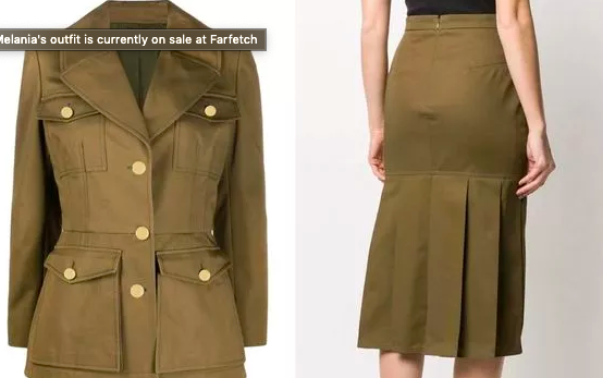 Bà diện trang phục màu xanh olive, gồm áo khoác dài tay theo phong cách quân đội với ve áo lớn, nhiều túi đính cúc màu đồng, phối cùng chiếc váy ôm người dài quá gối và thêm thắt lưng bản to màu đen nhấn nhá vòng eo. Melania đi giày cao gót mũi nhọn cùng tông và thả tóc đơn giản, không đeo trang sức.