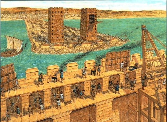 Alexander đại đế cho xây 2 tháp gỗ bọc da thô và đặt chúng ở cuối đường đắp cao đang xây dang dở. Các tháp này có gắn pháo để đáp trả đòn tấn công của quân Tyre. Ảnh minh họa: SlideShare