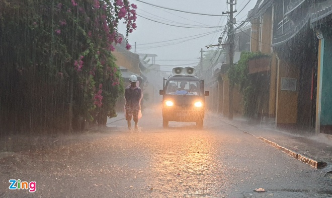 6h30 sáng 18/9, tại khu vực Chùa Cầu, phường Minh An, TP Hội An, Quảng Nam, có mưa lớn. Nước sông Hoài tại đây đang dâng cao hơn so với trước đó. Các tuyến đường như Trần Phú, Nguyễn Thị Minh Khai, Bạch Đằng không một bóng người.