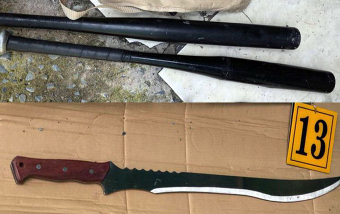 Mã tấu và gậy bóng chày hai nghi can sử dụng gây án. Ảnh: Công an cung cấp.