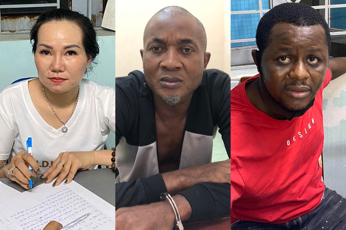 Phụng cùng chồng (giữa) và Chukwuemeka. Ảnh: Công an cung cấp.