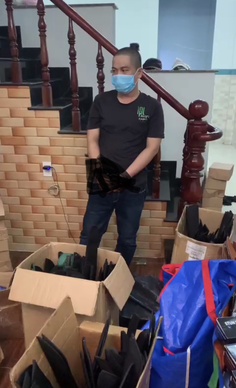 Lúc này, Tổ hình sự chặn lại kiểm tra hành chính thì phát hiện người đàn ông cất giấu trong bịch nilon 1 hộp màu đen. Bên trong hộp này có 1 súng bắn điện, 6 viên đạn, 1 bình xịt hơi cay hiệu Nato, kìm điện 801 Type, 5 bình bằng kim loại dùng để bơm ga sử dụng cho súng bắn bi sắt và 65 viên đạn bi màu vàng đồng.
