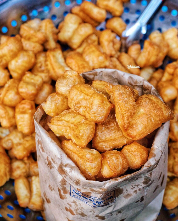 Quẩy nhỏ bằng 2 ngón tay, có vị ngọt nhẹ, xốp và dai và thơm mùi vừng. Những chiếc quẩy nóng hổi, thơm lừng khiến du khách có thể nhanh chóng ăn hết một túi quẩy trong thời tiết mát mẻ này. Quẩy được bán với giá 1000 - 2000 đồng/ cái. Bạn có thể mua tại các địa chỉ như 20 Nguyễn Tuân, 210 Quan Nhân, ngõ 85 phố 8/3 Quỳnh Mai... . Ảnh: Chubehanoi