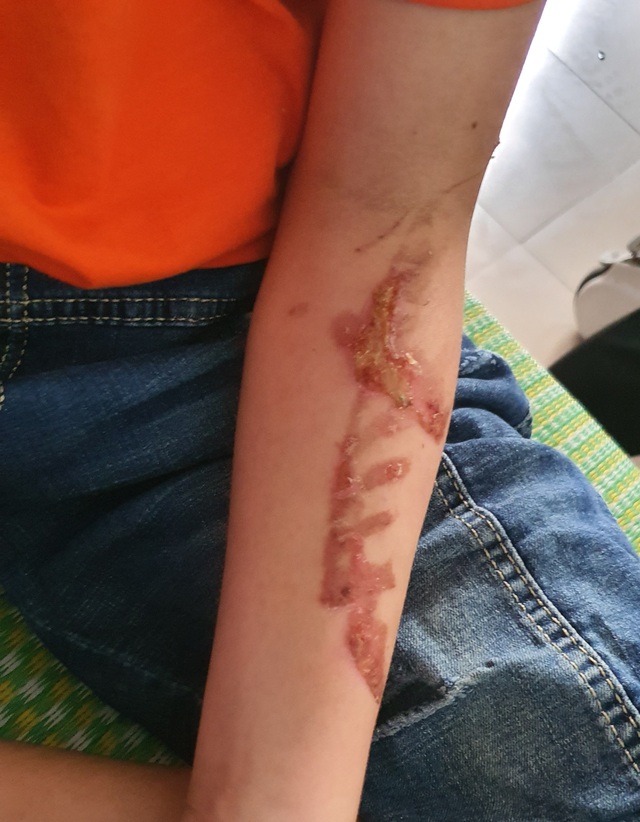 Vết thương dài trên tay cháu D. nghi do bà chủ quán gây nên.