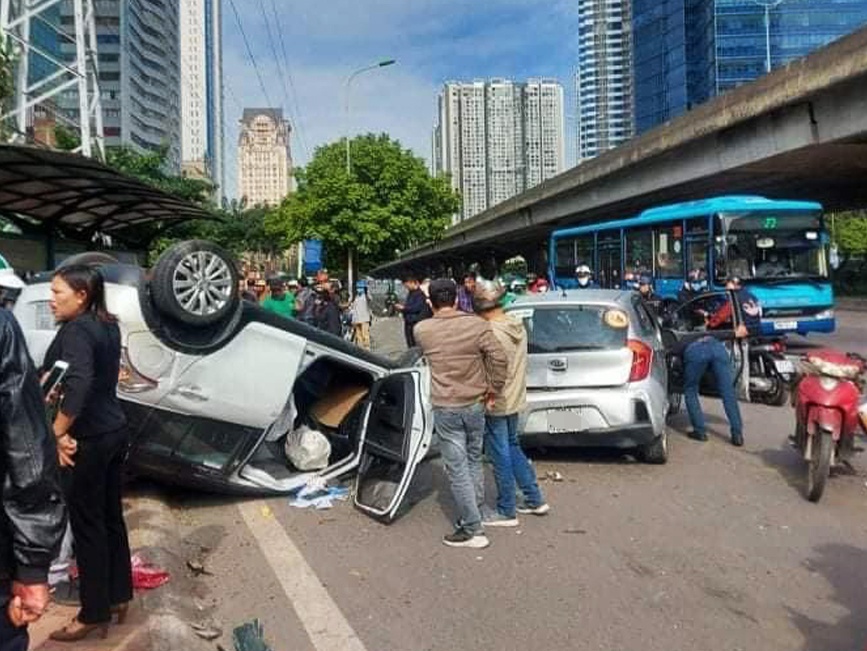 Tại hiện trường, ôtô con lật ngửa, nhiều mảnh vỡ của taxi và xe máy vương vãi dưới đường. Thông tin với ****, chỉ huy Đội CSGT số 6 Phòng CSGT Công an Hà Nội cho biết tai nạn khiến tài xế xe máy và người điều khiển ôtô 4 chỗ là anh N.V.T. bị thương.