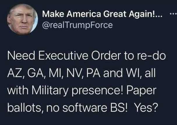 Tôi ủng hộ TT hăy lấy quyền mà hiến pháp cho phép đê tịch thu mọi tài liệu về phiếu và tổ chức bầu cử lại. Hy vọng với luật mới, chặt chẽ hơn, có đề pḥng rồi, ngăn cấm được bọn Big Tech như tên khốn Mark Zuckerberg tài trợ tiền để lũng đoạn, không cho bầu qua thư, phải có ID khi bầu…: th́ mọi gian lận của Dân Chủ sẽ bị chận đứng. Như thế công bằng cho tất cả, cho lá phiếu của người dân. https://www.newsmax.com/politics/tru...17/id/1002139/