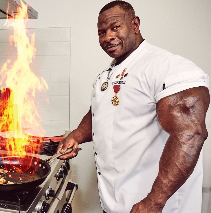 Để sở hữu cơ thể cường tráng như hiện tại, Rush chăm chỉ tập gym từ thời niên thiếu. Nói với tạp chí Men’s Health, nam đầu bếp cho biết anh thực hiện 2.222 lượt chống đẩy mỗi ngày. Đây là hoạt động hưởng ứng thử thách #22PushupChallenge, nhằm nâng cao nhận thức về PTSD - vấn đề sức khỏe tâm thần khiến khoảng 22 cựu chiến binh chết vì tự tử mỗi ngày. Rush thực hiện tối đa 200 lần chống đẩy cùng một lúc, với thời gian nghỉ 3-10 phút giữa mỗi hiệp. Anh đến phòng tập 1-2 tiếng mỗi ngày và tuân thủ quy tắc “72 giờ” - tập luyện một bộ phận cơ thể nhất định trong vòng 3 ngày. Ảnh: Wearethemighty.