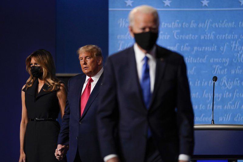 Tổng thống Trump và phu nhân Melania đứng trên sân khấu khi đối thủ Joe Biden rời khỏi cuộc tranh luận cuối cùng tại đại học Belmont ở Nashville, Tennessee, ngày 22/10/2020. Ảnh: AP.