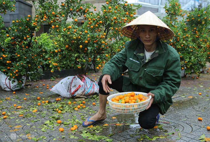 Trưa 9/2, bên vỉa hè đại lộ Lê Nin, TP Vinh, anh Độ dựng lại hàng chục chậu quất cảnh cao khoảng một mét bị đổ sau trận mưa giông lúc 3h sáng. Với người buôn cây cảnh thời vụ như anh Độ, đây là trận mưa tai hại bởi không thể che chắn.Hơn một tuần trước, anh Độ chung vốn với bạn đưa 350 gốc quất cảnh, giá trị 330 triệu đồng từ tỉnh Hưng Yên về thuê địa điểm bán. Họ dự tính mỗi gốc sau khi trừ chi phí sẽ lời 100.000-300.000 đồng tùy kích cỡ. Những ngày qua khách mua lẻ tẻ, họ mới bán được gần 100 gốc.
