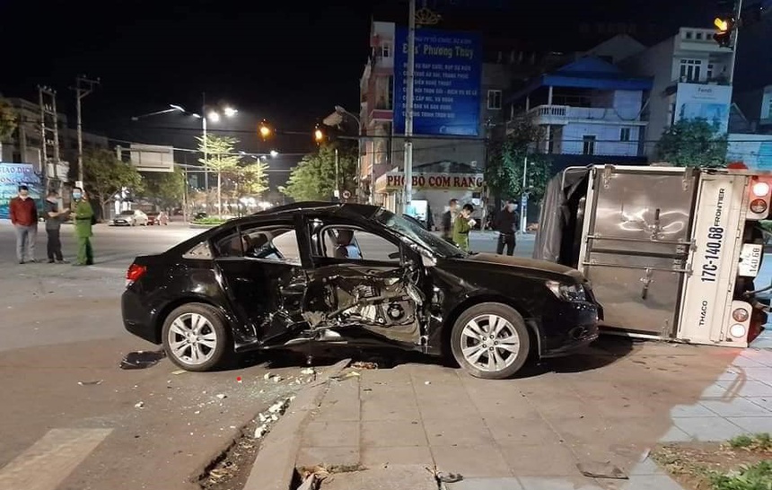 Sau va chạm, xe tải lật nghiêng, còn chiếc Chevrolet văng lên vỉa hè, hư hỏng nặng. 6 người trên hai xe bị thương nặng và được người dân đưa đi bệnh viện cấp cứu.