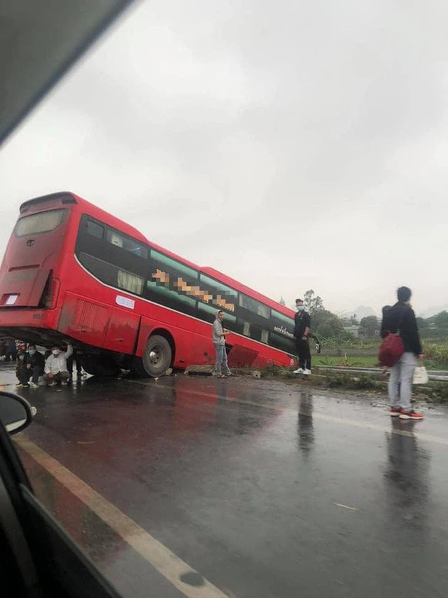 Cụ thể, 3 người đàn ông có mặt tại hiện trường một vụ tai nạn giao thông. Không rõ vì nguyên nhân gì mà chiếc xe khách lại lao vào lên dải phân cách, nằm chắn ngang một làn đường, đầu lao xuống ruộng, còn đuôi xe nhấc bổng lên. Hiện chưa rõ thiệt hại từ vụ việc.