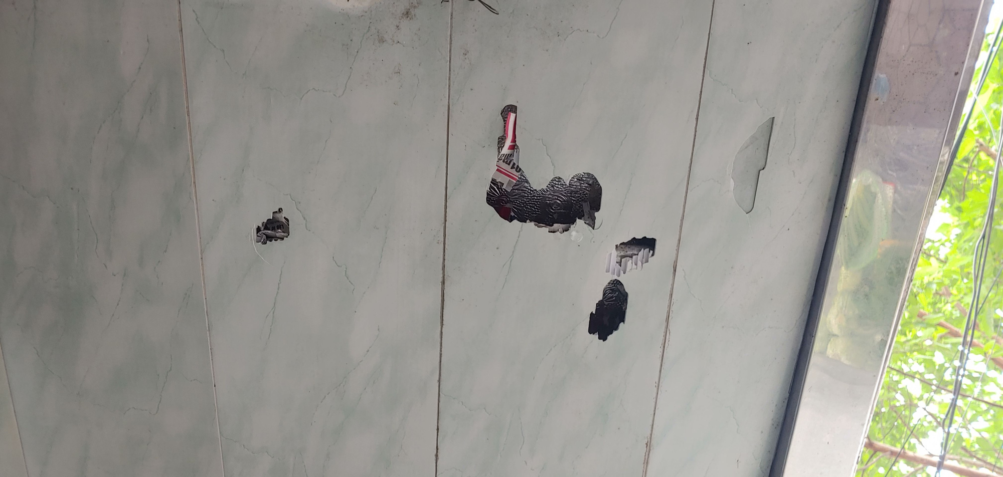 Ngay sau đó, ông Sơn ra ngoài kiểm tra thì phát hiện có rất nhiều giấy vụn trước vỉa hè, phần ốp nhựa trần nhà bị vỡ, cửa tôn bị méo, kính bị vỡ...