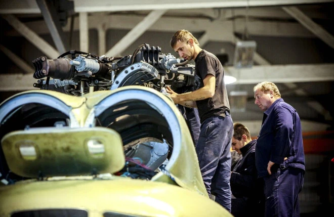 Nhân viên của nhà sản xuất động cơ máy bay Ukraine Motor Sich lắp ráp một chiếc trực thăng ở Zaporizhia, thành phố cách Kyiv nơi đặt trụ sở của công ty 550 km về phía Đông Nam, vào ngày 14 tháng 10 năm 2014. Ảnh: Kyiv Post