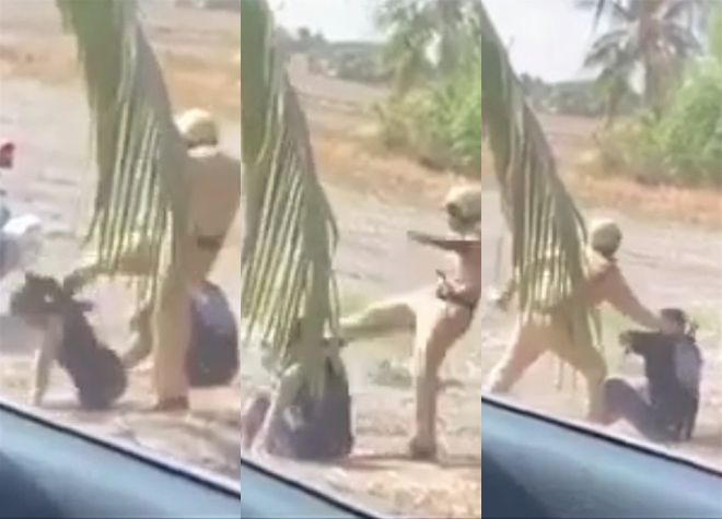 According to the clip content provided by Mr. K., with the camera angle shot from a person sitting in a car, through the glass of the car, looking down at the dry field, he observed a special motorcycle, 1 person in uniform. Traffic police and 1 young man in black. The traffic police hit the young man's head hard, making him angry, and then another traffic police came up and grabbed his shirt and punched him in the head, a few seconds later, the traffic police pulled 1 Another young man in black and white came to sit near the original young man. Continuing to say a few sentences back and forth, a traffic police raised their feet and stepped on the heads of 2 young men, the two people sitting there just raised their hands to support them.