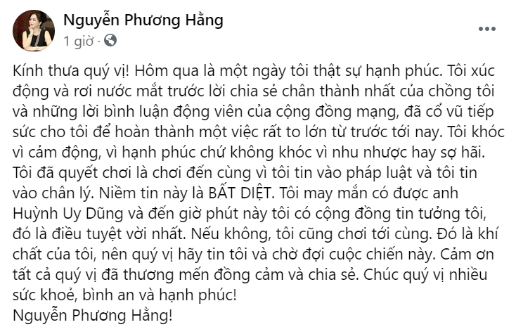 Mới đây, trên trang cá nhân của mình, bà Nguyễn Phương Hằng cũng đăng tải dòng trạng thái mới. Trong đó, bà gửi lời cảm ơn sâu sắc đến người chồng là ông Huỳnh Uy Dũng cũng như cộng đồng đã yêu mến và tin tưởng bà suốt thời gian qua. “Tôi đã quyết chơi là chơi đến cùng vì tôi tin vào pháp luật và tôi tin vào chân lý. Niềm tin này là bất diệt. Tôi may mắn có được anh Huỳnh Uy Dũng và đến giờ phút này tôi có cộng đồng tin tưởng tôi, đó là điều tuyệt vời nhất”, nữ doanh nhân chia sẻ trên trang cá nhân.
