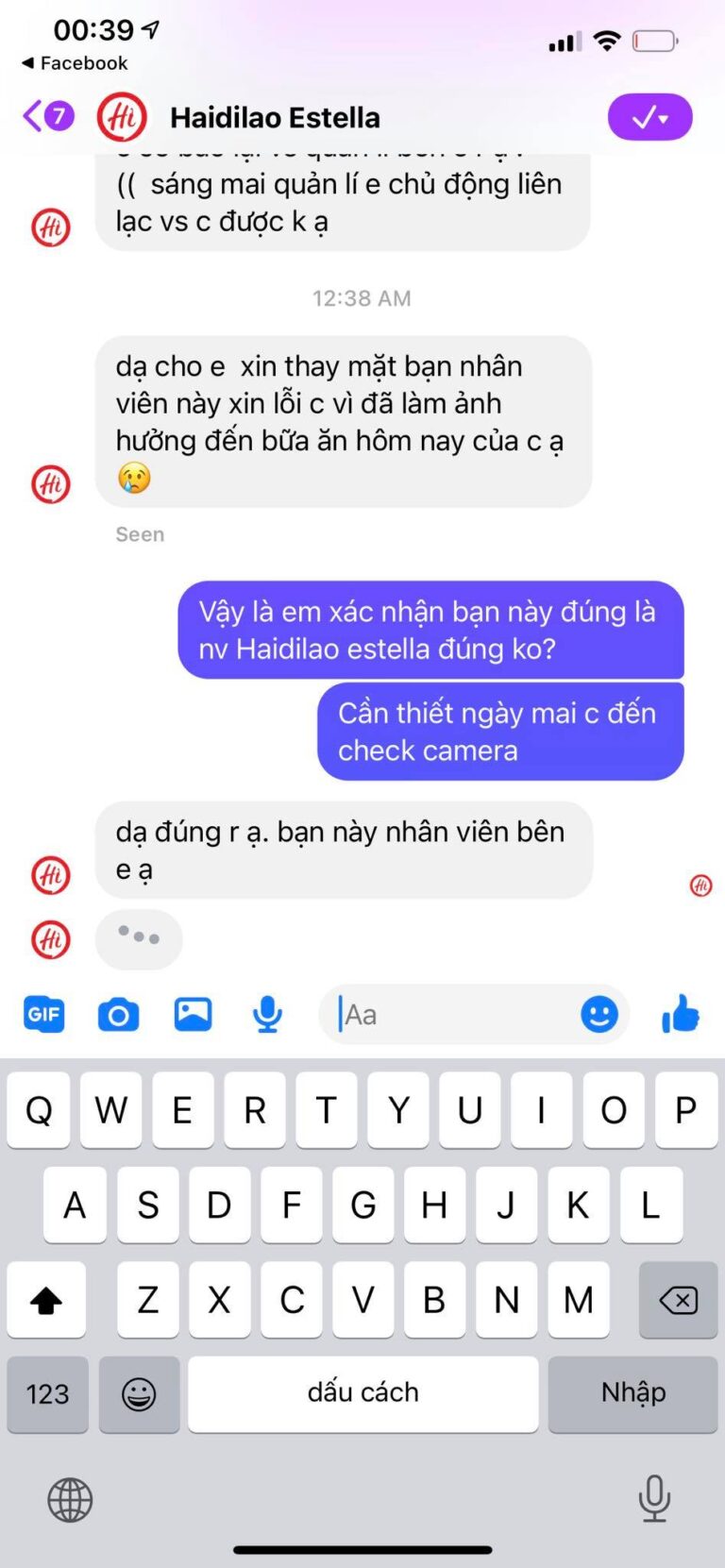 Được biết, cô cũng đã nhắn tin với fanpage của nhà hàng lẩu H và được xác nhận thông tin về nhân viên trên. Qua tin nhắn trao đổi, đại diện fanpage của nhà hàng H đã gửi lời xin lỗi tới vợ của Only C, đồng thời xác nhận nhân viên trên đúng là thuộc quyền quản lý của nhà hàng.