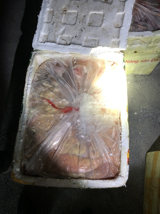 Khi kiểm tra trên xe, cảnh sát phát hiện 11 thùng xốp bên trong có chứa sản phẩm động vật là nội tạng trâu, bò, lợn và trứng gà non. Toàn bộ sản phẩm này đang bốc mùi hôi thối. Tổng số trọng lượng 11 thùng xốp đựng nội tạng này là 985kg.