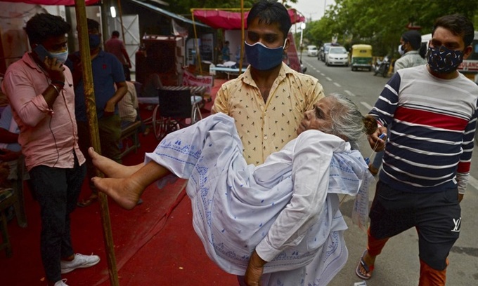Người thân đưa bệnh nhân Covid-19 bị khó thở đến trung tâm hỗ trợ oxy miễn phí ở ngoại ô New Delhi, Ấn Độ hôm 10/5. Ảnh: AFP.