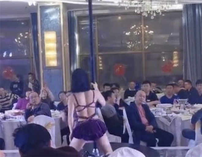 Mới đây, trong tiệc cưới mới diễn ra ở Trương Gia Khẩu (Hà Bắc), nữ vũ công mặc váy siêu ngắn màu tím, hở gần như hoàn toàn phần lưng, đeo khẩu trang đen, biểu diễn những động tác múa cột khêu gợi trước nhiều vị khách đứng tuổi.