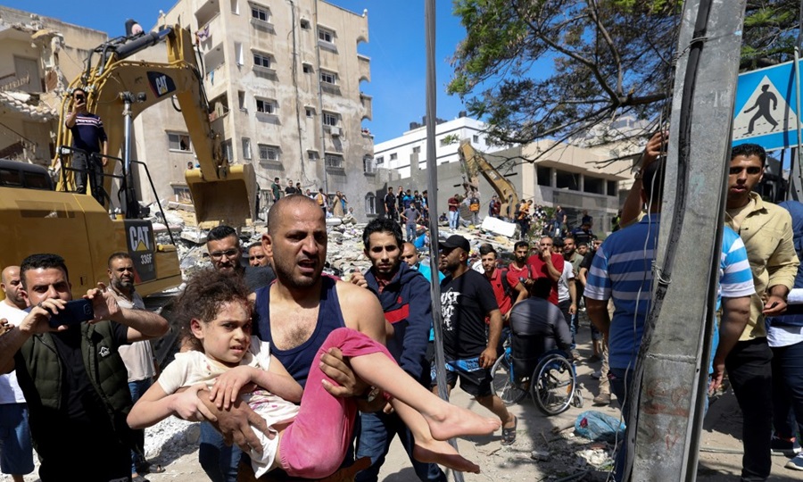 Người Palestine sơ tán một bé gái bị thương khỏi đống đổ nát của tòa nhà bị phá hủy ở khu dân cư Rimal, thành phố Gaza sau đòn không kích của Israel hôm nay. Ảnh: AFP.
