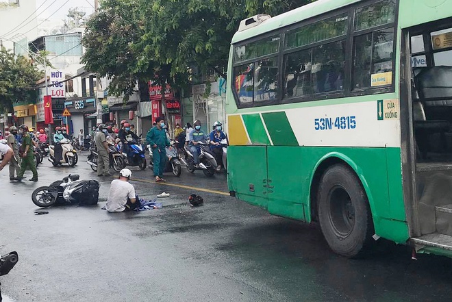 Cú va chạm với xe buýt số 6 khiến hai cha con đi trên xe máy ngã xuống đường Đặng Văn Bi, phường Trường Thọ (TP Thủ Đức). Con gái bị xe cán tử vong, người cha bị thương ở chân.