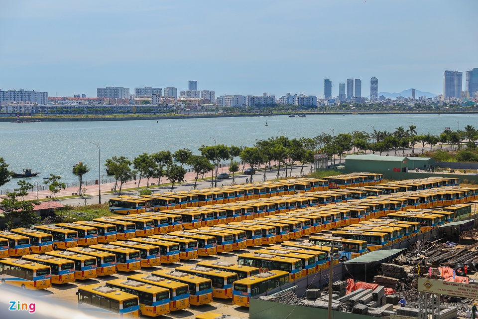 Không có hành khách, hầu hết hãng vận tải hành khách đường dài, xe buýt nội thành, liên tỉnh từ Đà Nẵng vào Quảng Nam và ra tỉnh Thừa Thiên - Huế phải dừng hoạt động. "Hơn 100 xe buýt của công ty đã phải dừng hoạt động từ ngày 7/5 khiến toàn bộ tài xế, phụ xe và người lao động rơi vào cảnh thất nghiệp", chị Ngân, nhân viên trạm xe buýt Xuân Diệu thông tin. Trong ảnh là xe buýt đậu kín ở lô đất trống gần cầu Thuận Phước.