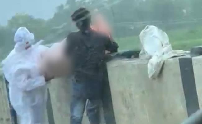 Hai người đàn ông khiêng một thi thể đặt lên thành cầu, chuẩn bị đẩy xuống sông. Ảnh: NDTV