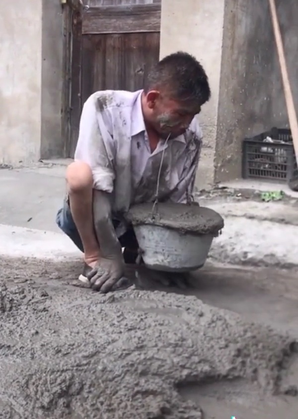 Trong đoạn clip, người đàn khó nhọc di chuyển, miệng ngậm chặt quai của chiếc xô, tay dính đầy vữa đang giúp chân di chuyển chậm chạp về phía trước. Mặc dù vất vả, cực nhọc, cả người lấm lem bẩn nhưng người đàn ông này vẫn không bỏ cuộc.