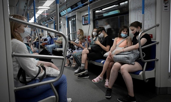 Hành khách đeo khẩu trang trên một toa tàu điện ngầm ở Moskva, Nga hôm 27/6. Ảnh: AFP.