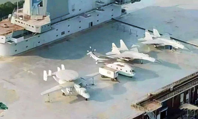 Một bức ảnh chụp trước đó cho thấy chiếc J-35 mới được đưa lên "tàu sân bay".