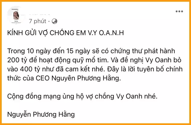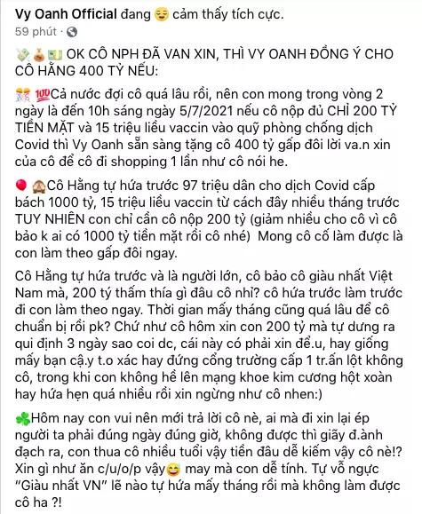 Trước đó, sáng 3/7, trên trang cá nhân Vy Oanh tuyên bố sẽ tặng bà Hằng 400 tỷ đồng như lời bà Hằng mong muốn, với điều kiện bà Hằng phải nộp đủ 200 tỷ đồng tiền mặt và 15 triệu liều vaccine vào quỹ phòng chống dịch Covid-19.