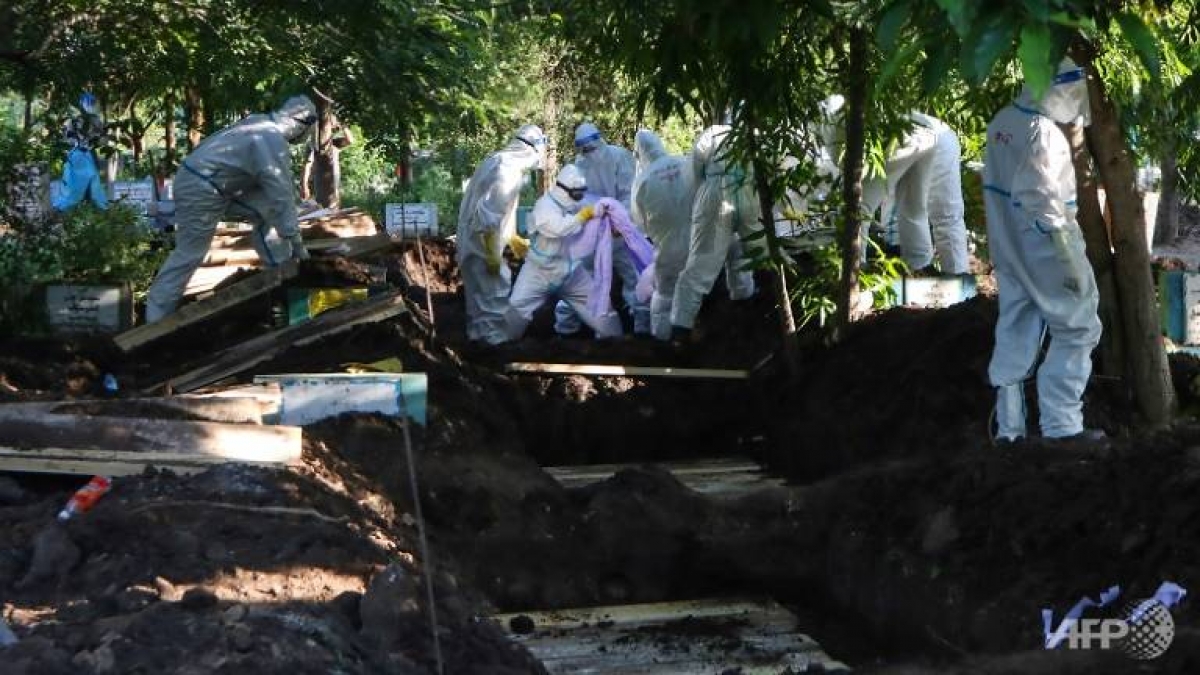 Chôn lấp thi thể bệnh nhân Covid-19 tại Myanmar. Ảnh: AFP