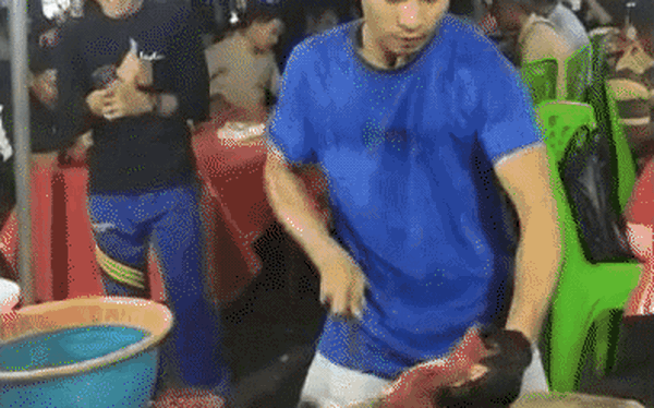 Chàng trai được mệnh danh 'thiên hạ đệ nhất chặt cá'. Quan khách không khỏi trầm trồ trước tài nghệ của anh. Người đàn ông dùng dao làm cá nhanh như chớp.