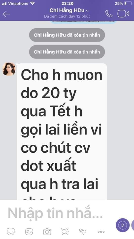 PH từng nt mượn tiền tôi 20 tỷ sau đó năn nỉ 10 tỷ cũng được tôi kg cho thì bị PH đòi quà đã từng tặng tôi. Tôi đem hết đến nhà trả và nhắn tin cho PH kể từ hôm nay tôi không bao giờ nhắc tên bạn nữa và bạn cũng đừng nhắc đến tên tôi coi như chúng ta chưa từng quen biết nhau. Quà tặng thì đòi, còn quà tôi tặng PH hơn 4000 đô thì PH thích nên giữ lại tôi cũng vui vẻ. Gần đây tôi có theo dõi PH kiện VHY thì tôi có nt cho PH Khuyên là đừng lên mạng chửi mà hãy tập trung vào vụ kiện, bé M lớn r bé nhạy cảm tội nghiệp bé. PH nhắn lại CON Đ***, MÀY DẠY ĐỜI TAO À ( còn lưu tn)."