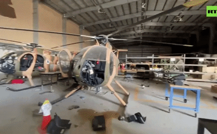 Bên trong nhà chứa máy bay bị bỏ lại, những chiếc trực thăng Black Hawk do Mỹ sản xuất nằm bất động trong tình trạng "há miệng" do binh sĩ Mỹ tác động để vô hiệu hóa chúng. Các bộ phận cảm biến và động cơ đã bị loại bỏ, dây điện bị cắt, và nơi từng là khoang chứa hệ thống điện tử bị gỡ bỏ toàn bộ những thứ bên trong.