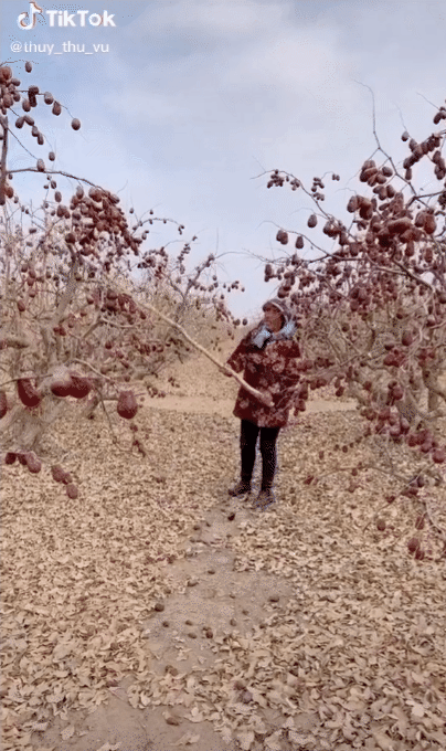 Một video ghi lại cảnh thu hoạch loại quả lạ ở nước ngoài. Người phụ nữ này liên tục dùng gậy đập mạnh vào những gốc cây trơ trụi cành lá, để rớt xuống đất hàng loạt quả màu đỏ sẫm kỳ lạ.