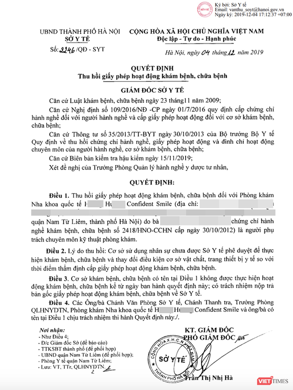Thông báo về việc thu hồi giấy phép hoạt động của Nha khoa H.H.