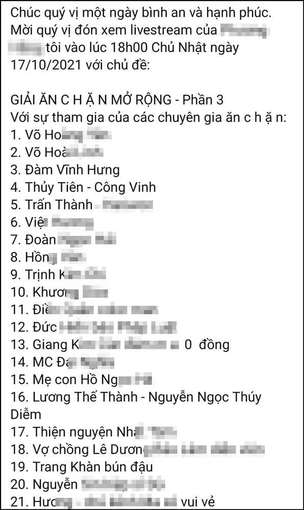 Bà cũng giới thiệu luôn "sự tham gia của các chuyên gia ăn chặn", gồm 36 cái tên, từ sao hạng A đến sao hạng B, hạng C, lẫn một số cá nhân, hội thiện nguyện, chủ kênh Youtube nổi tiếng...