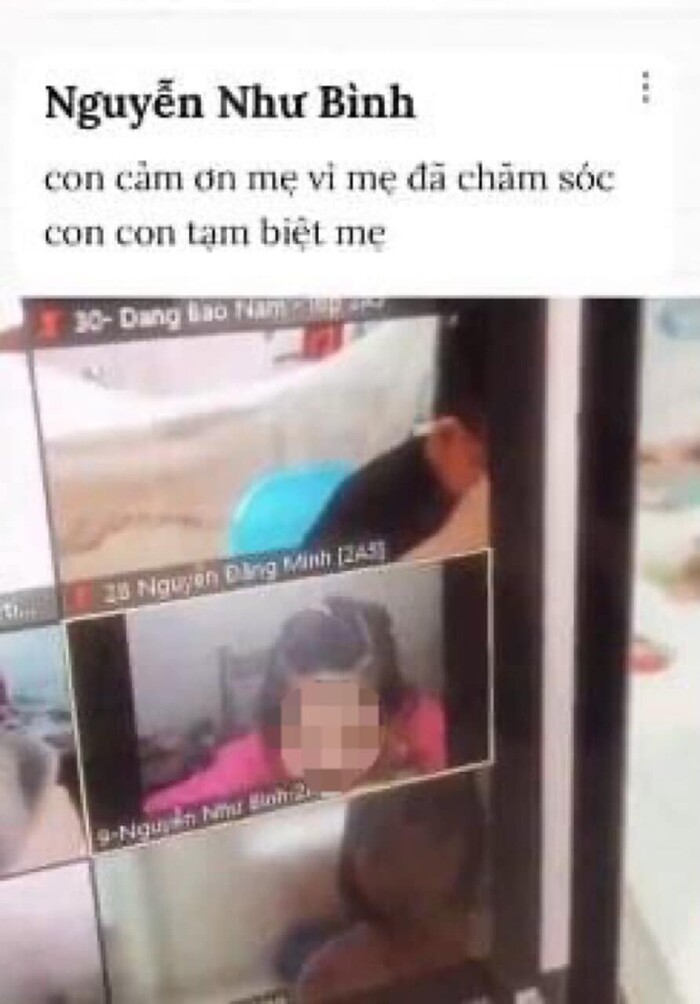 Trước câu chuyện của học trò, cô giáo đã vội vàng động viên và xoa dịu cô bé: "Thôi nhé, thôi được rồi, Như Bình ngoan nhé. Chắc chắn là khi nào hết dịch, con sẽ gặp lại mẹ nhé. Thôi không khóc nữa con nhé. Như Bình ơi, cô bảo này, Như Bình phải cố gắng rất là nhiều, con phải cố gắng lên thì con sẽ được gặp lại mẹ. Cô khen Như Bình giỏi".