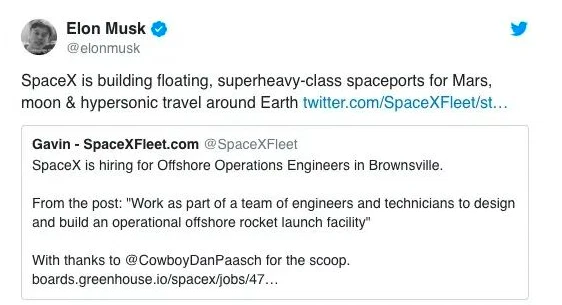 Tỷ phú Elon Musk tiết lộ trên Twitter: "SpaceX đang xây dựng một cảng vũ trụ nổi, siêu nặng phục vụ cho mục đích thám hiểm Sao Hỏa, Mặt trăng và du hành siêu thanh vòng quanh trái đất".