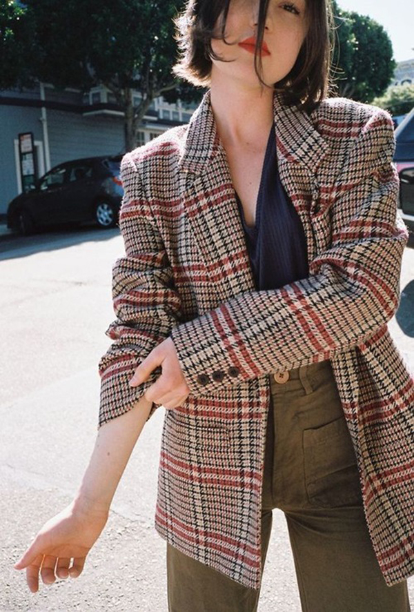 Chiếc áo blazer màu nâu kẻ xanh và đỏ mang hơi thở cổ điển cho nàng mê style vintage.