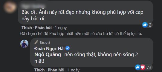 Thậm chí nhiều fanpage đã chia sẻ lại hình ảnh này với dòng trạng thái không hay. Thẳng thắn đáp trả những ý kiến tiêu cực, ông Đoàn Ngọc Hải cho rằng: "Nên sống thật, không nên sống 2 mặt".