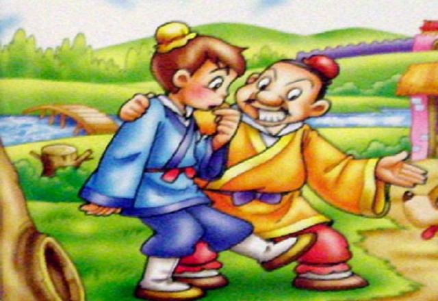 Hai người cãi nhau và ai cũng cố làm cho người kia phải bằng lòng nghe theo lời mình. Cãi nhau mãi vẫn không xong bèn xoay ra đánh nhau. Họ đánh nhau ngay giữa đường nên lúc ấy có một người cưỡi ngựa đi qua, hai chàng bèn nắm chặt cổ áo nhau, kéo đến trước mặt người cưỡi ngựa nhờ người ấy phân xử.
