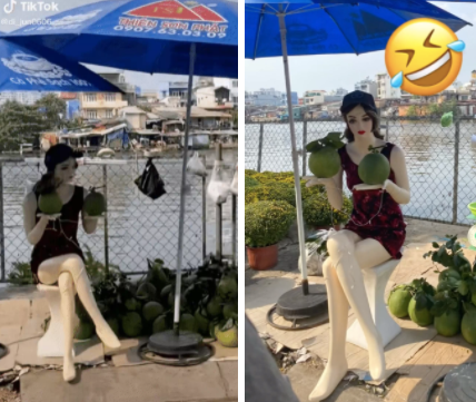 Theo đó, chủ nhân hàng bán bưởi đâu không thấy mà anh chỉ thấy mỗi một con ma-nơ-canh ngồi vắt chéo hai chân, trên tay cầm 2 trái bưởi như gọi mời người qua đường.