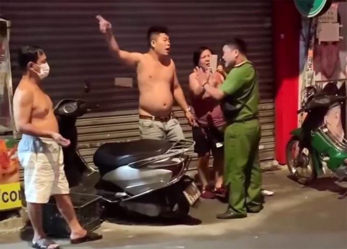 Hùng (cởi trần, giữa) cãi vã với công an, trong khi mẹ anh ta quay video. Ảnh cắt từ clip