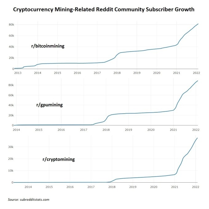 Lượng thành viên tham gia thảo luận về khai thác tiền điện tử tăng cao trên Reddit. Nguồn: Subreddit Stats