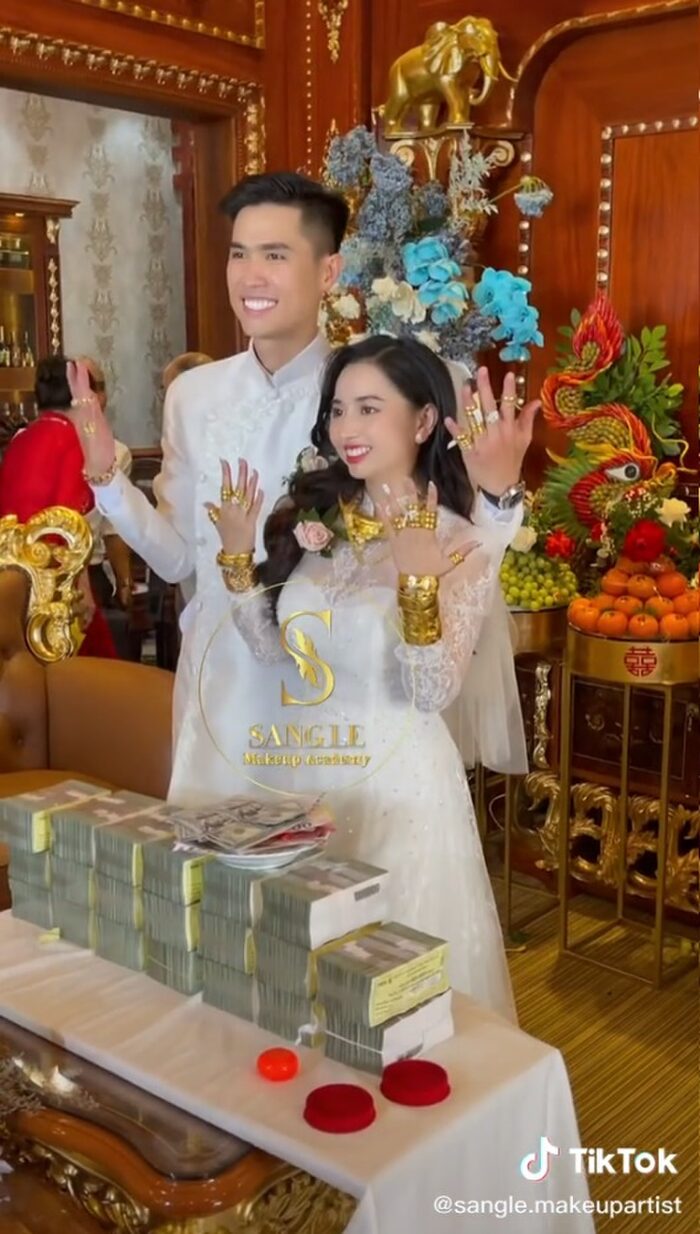 Anh Sang Lê - chuyên viên makeup cho cô dâu - đăng tải những hình ảnh từ đám cưới hoành tránh này kèm lời chia sẻ: cô dâu - chú rể đã nhận quà cưới là 10 tỷ đồng tiền mặt, 20 cây vàng, xe BMW trị giá 3 tỷ đồng, bộ trang sức kim cương lấp lánh,...
