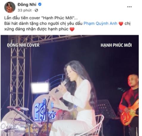 Cho đến mới đây, Đông Nhi bất ngờ cover bài hát Hạnh Phúc Mới của đàn chị trong đêm nhạc ở Đà Lạt. Trong lúc biểu diễn ca khúc hot của Phạm Quỳnh Anh, vợ Ông Cao Thắng đã úp mở: "Gửi lời chúc phúc, một hạnh phúc mới dành cho người chị thân thiết".